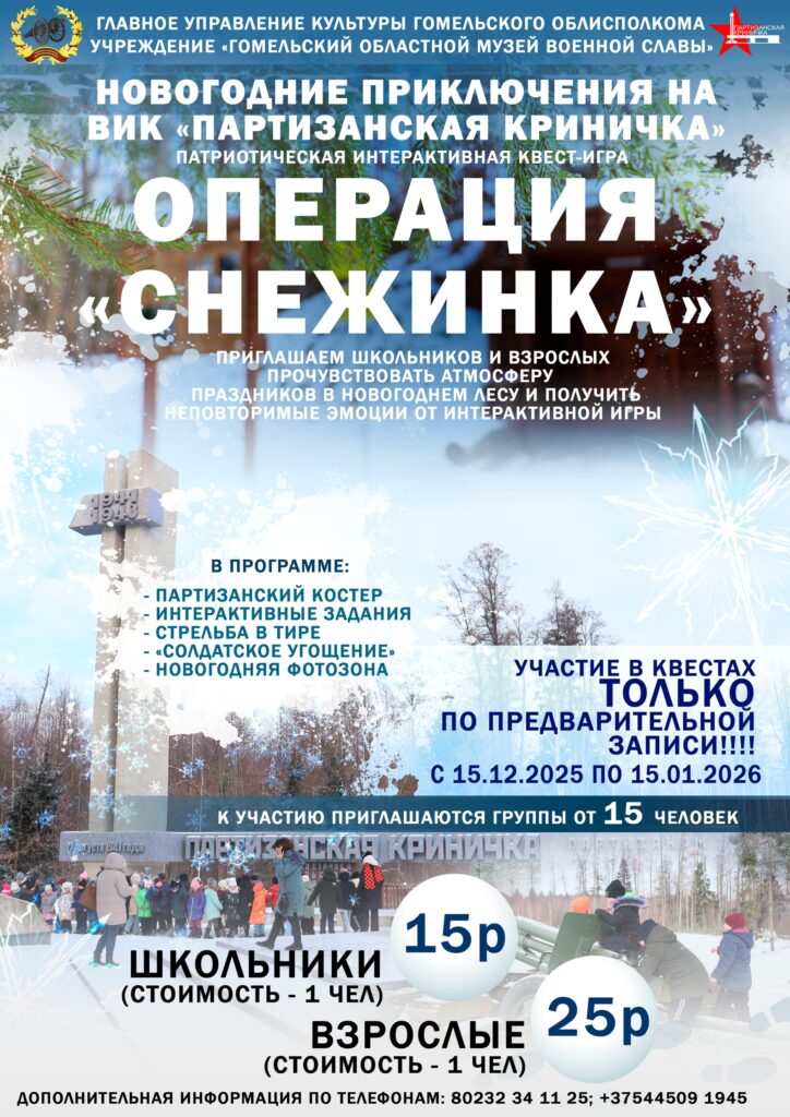 Уважаемые гомельчане и гости нашего города! Гомельский областной музей военной славы приглашает Вас на зимние интерактивные квесты «Операция «СНЕЖИНКА», которые будут проходить на военно-историческом комплексе«Партизанская криничка».