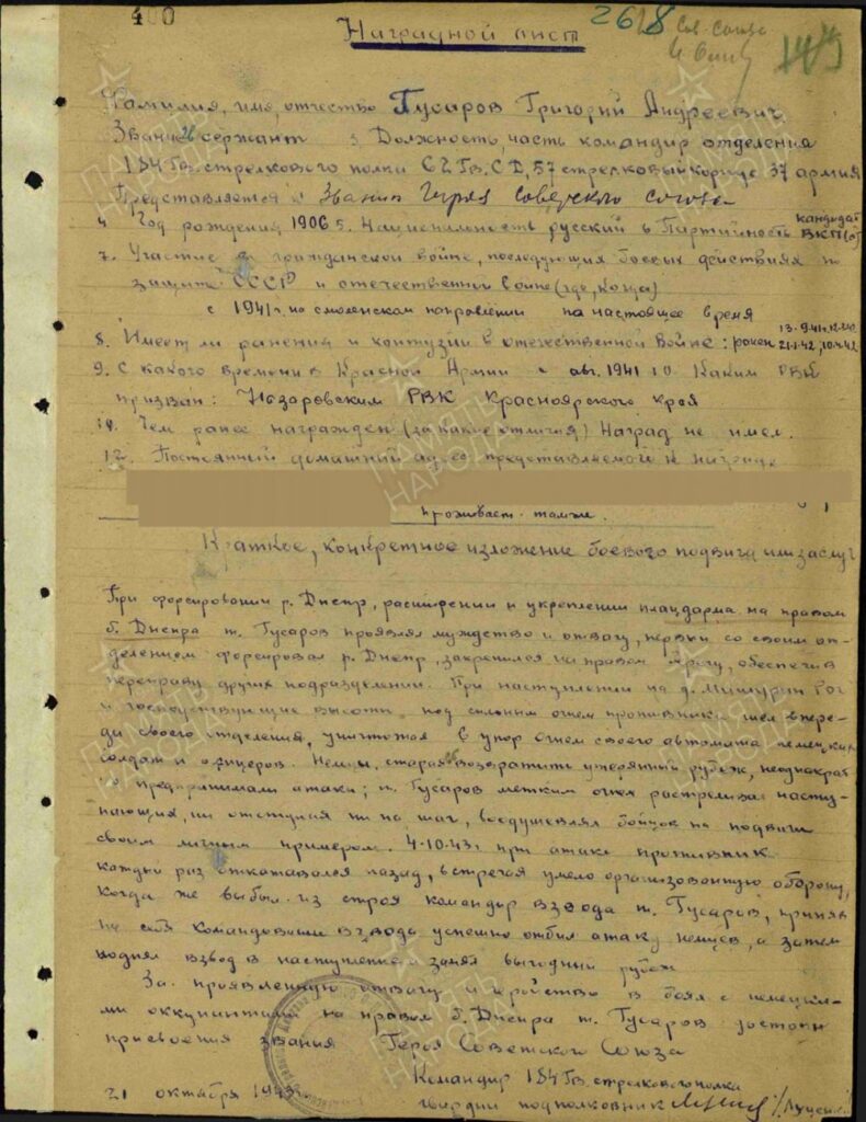 В ноябре 1943 года Г. А. Гусаров принимал участие в Знаменской операции, а в конце ноября 62-я стрелковая дивизия, в которой он воевал, была переведена в состав 52-й армии. В ходе дальнейших боев в Смелянском районе Черкасской области УССР, Григорий Андреевич 23 декабря 1943 года погиб. Указом Президиума Верховного Совета СССР от 22 февраля 1944 года за «образцовое выполнение боевых заданий командования при форсировании реки Днепр, развитие боевых успехов на правом берегу реки и проявленные при этом отвагу и геройство» Гусаров Григорий Андреевич был посмертно удостоен звания Героя Советского Союза. В память о нем установлен памятный знак на Аллее Героев в городе Рогачеве.