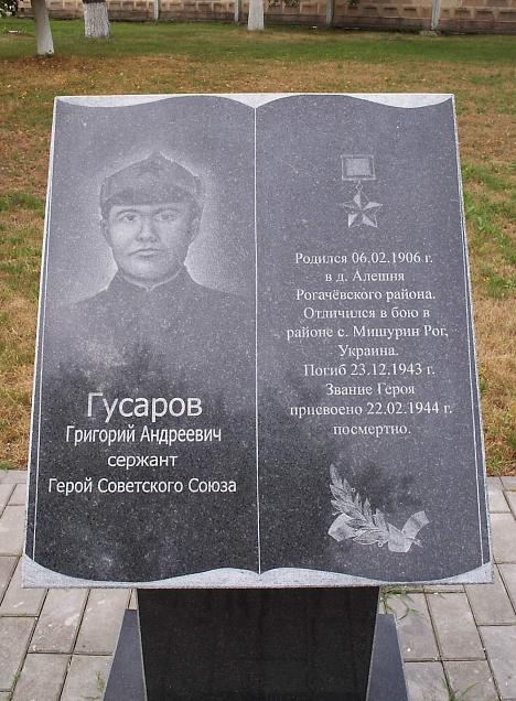 6 февраля 1906 года в деревне Олешня Рогачевского района в крестьянской семье родился Григорий Андреевич Гусаров. В дальнейшем семья Г. А. Гусарова переехала в Енисейскую губернию в деревню Холма (нынешнего Назаровского района Красноярского края). Уже там Григорий Андреевич окончил начальную школу, после чего начал свою трудовую деятельность, работая в колхозе.